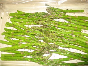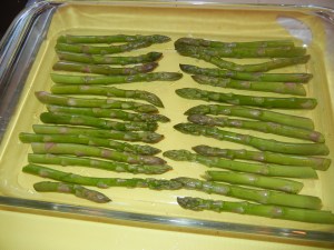 First you clean and trim the Asparagus. I usually trim off the bottom third of the stalk where it is most tough and woody. I put the Asparagus into a glass microwave safe dish, cover with plastic wrap and cook for 1 minute, 30 seconds.