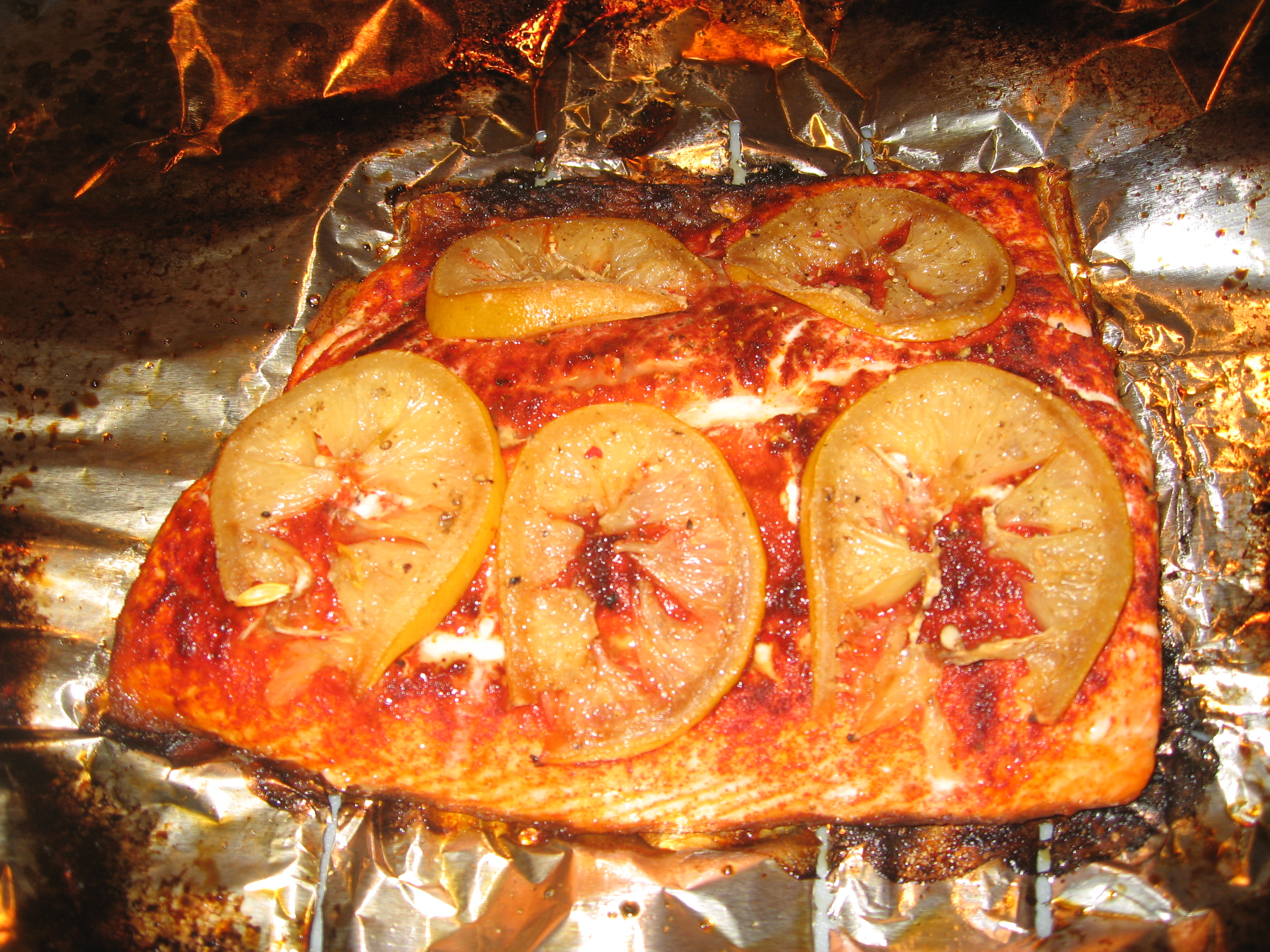 Next I rub the fish, inside and out with olive oil. I like to use a lemon olive oil to add some extra flavor to the fish. I also slice a lemon into thin slices to place on the outside of the fish. This helps protect the meat and give it a little lemon flavor.