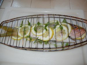 First I give the fish basket a spray of oil, to keep things from sticking. Next I place some lemon slices and herbs on the wire fish basket, then place the fish on top of them. I add lemon slices and herbs onto the fish, then close the basket. It should look something like this: