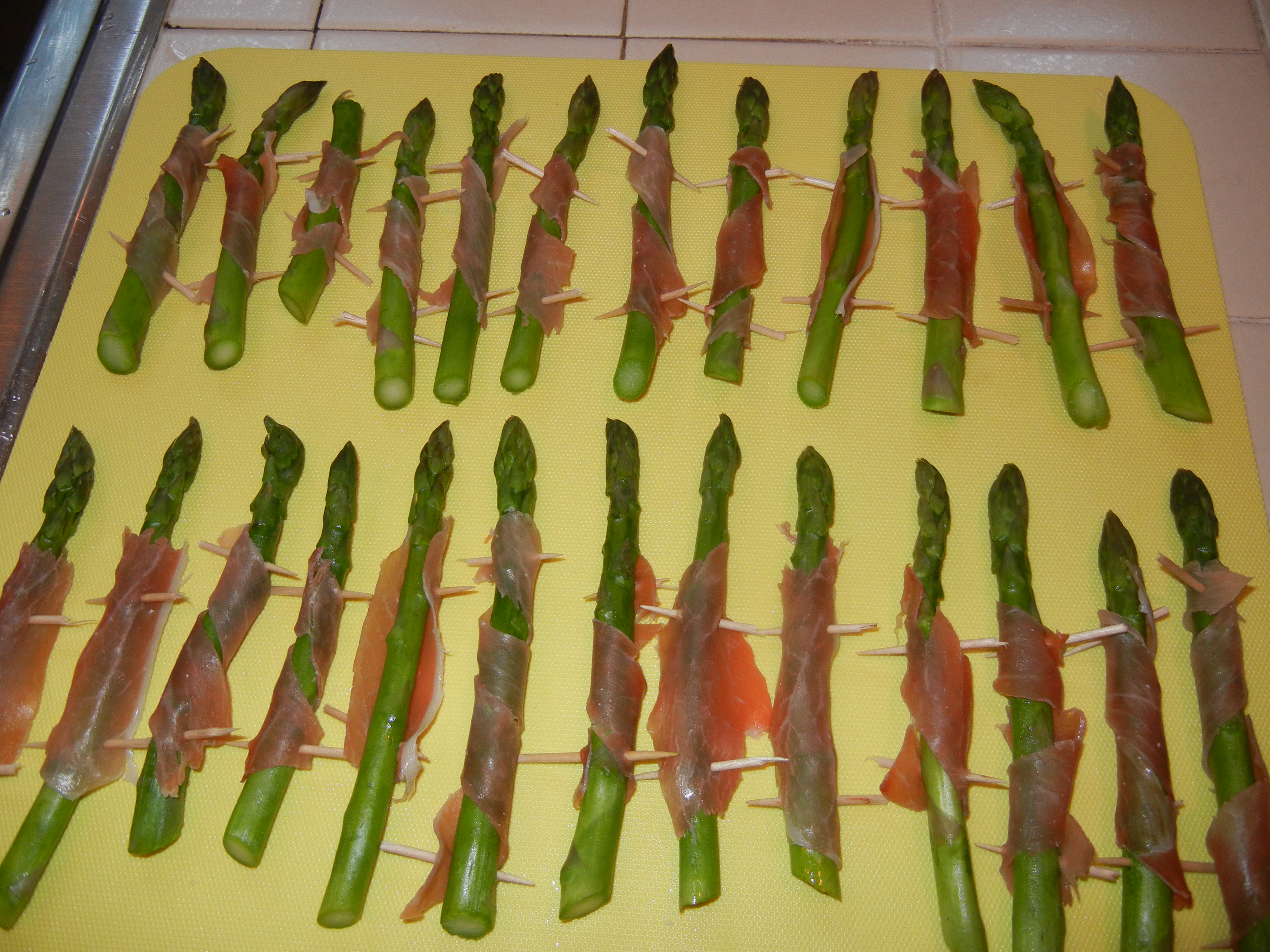Once the Asparagus is cool enough to work with. Take each stalk and wrap a piece of Prosciutto around it (like a candy cane stripe). Secure both ends with toothpicks and set it aside.