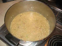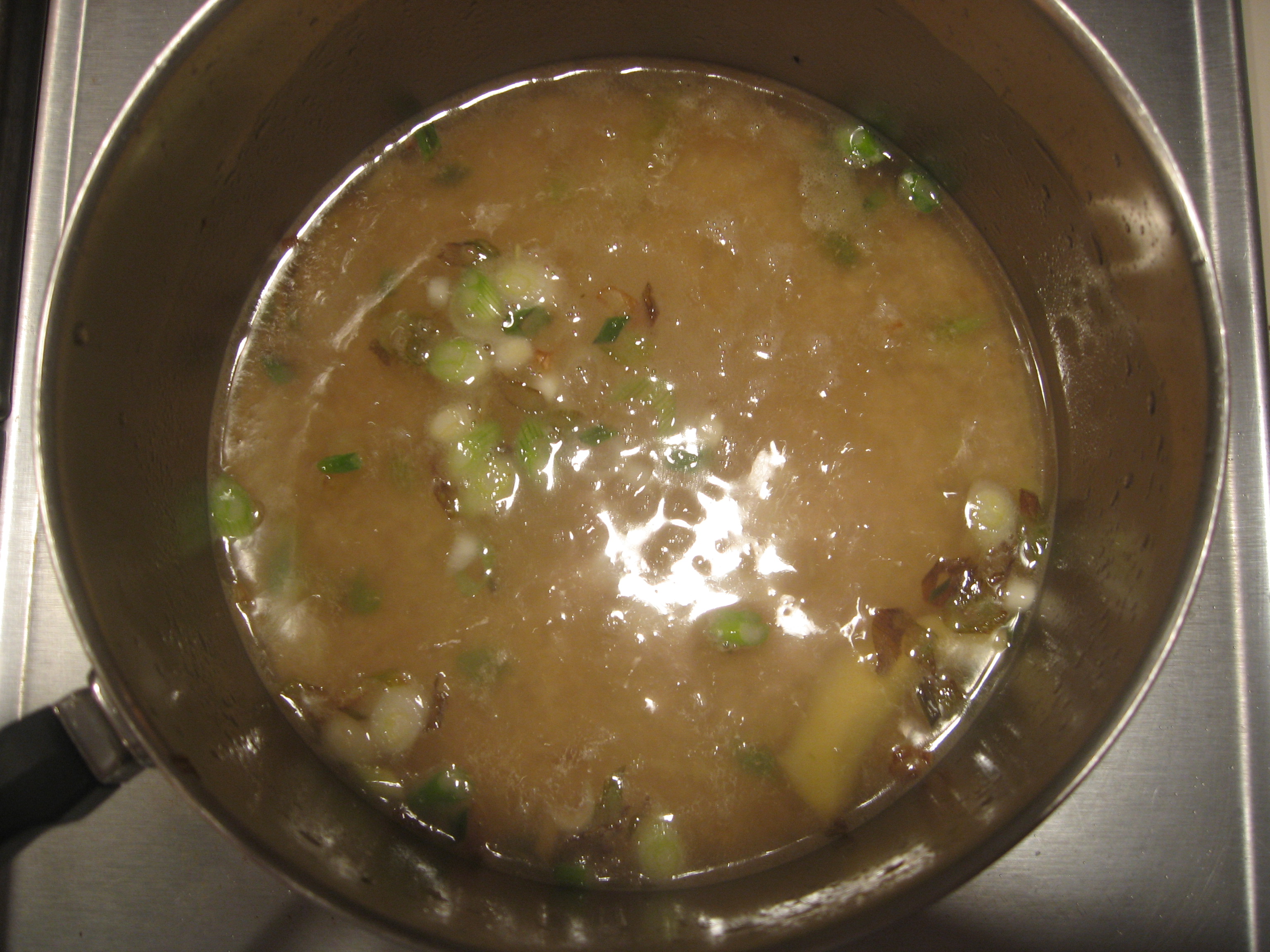 In a medium pot, I added 4 cups of Chicken Broth and began heating it up.  I cut up 1 bunch of Green Onions into 1/4 inch slices and added them to the Chicken Broth.  I also peeled a 1-inch piece of Ginger root and sliced it into 1/4 inch slabs, then added them to the Chicken Broth.  Once the broth was boiling I added 2 cups of Basmati rice (basically followed the package directions for water to rice ratio).  The directions said to stir the rice and broth, then reduce the heat, cover and leave it alone – so I did just that.