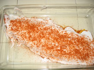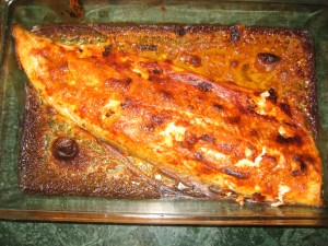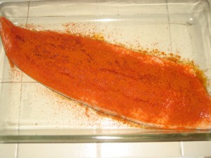 I purchased an Arctic Char filet, rinsed it and rubbed it with olive oil, then coated it with Tandoori seasoning.  I used the Penzey’s Spices Tandoori Seasoning and coated the fish heavily with it, placing it into a glass baking dish.  Then I covered it, put it into the refrigerator and let it sit for 2 hours.